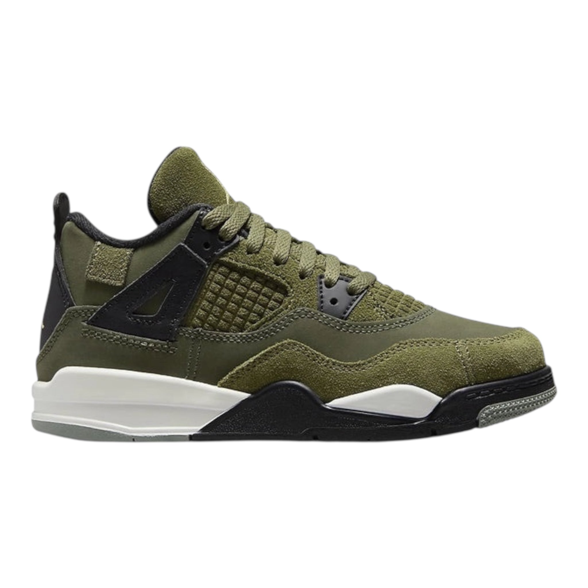 The Jordan 4 Retro SE Craft Medium Olive (PS) dresses this iconic silhouette in a tonal mixture of fabrics that are somewhat unusual for this silhouette. This singular sneaker is sized specifically for preschool-aged kids.