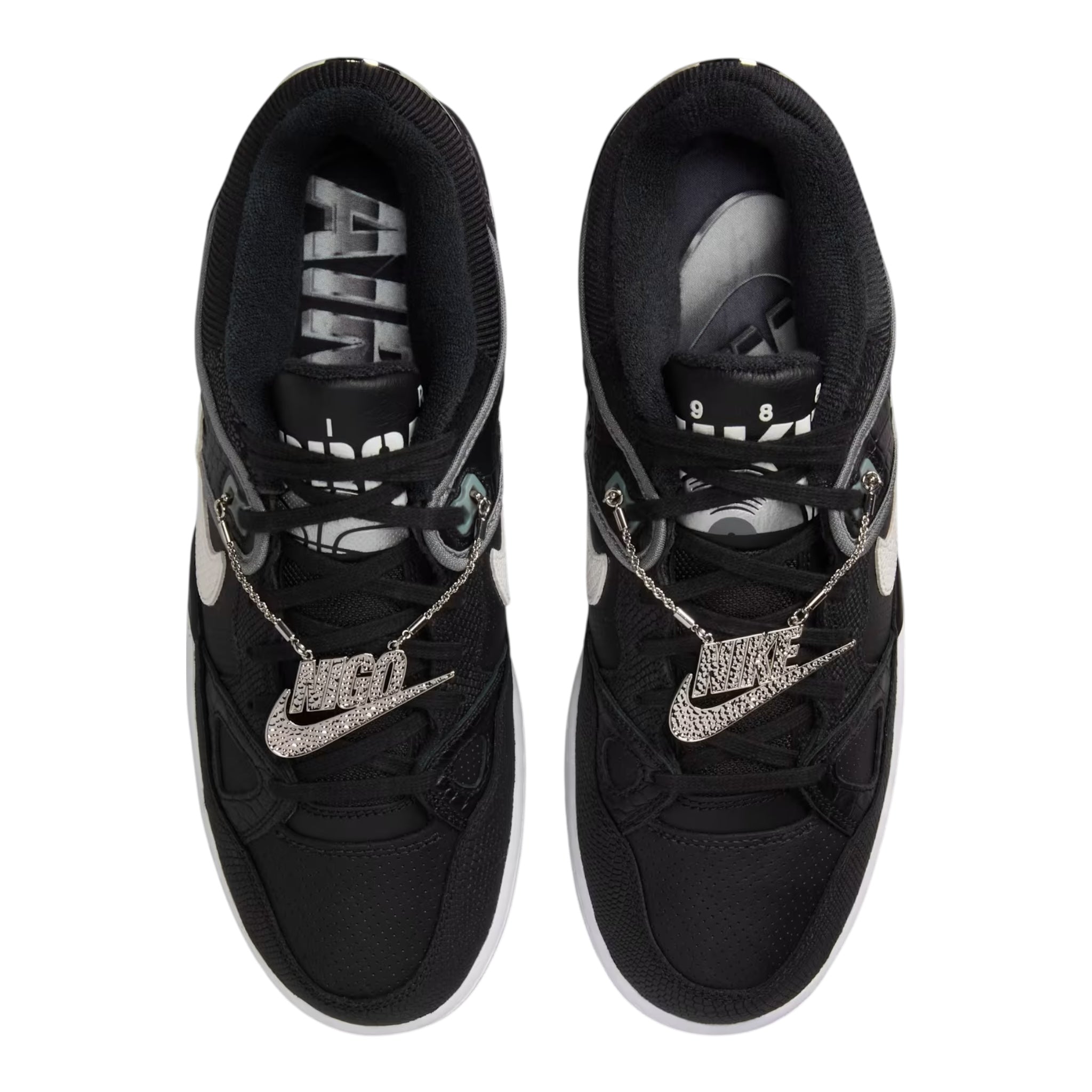 The Nike Air Force 3 Low SP Nigo Black White revives a retro basketball silhouette, reinterpreted through a clean, classic color scheme. The colorway features Black, Smoke Grey, Metallic Platinum, and White. The structured, mid-90s inspired design uses paneled leather construction, with Black dominating the upper. This silhouette is notable for its chunky profile and multi-layered aesthetic, characteristic of late-eighties and early-nineties court shoes.