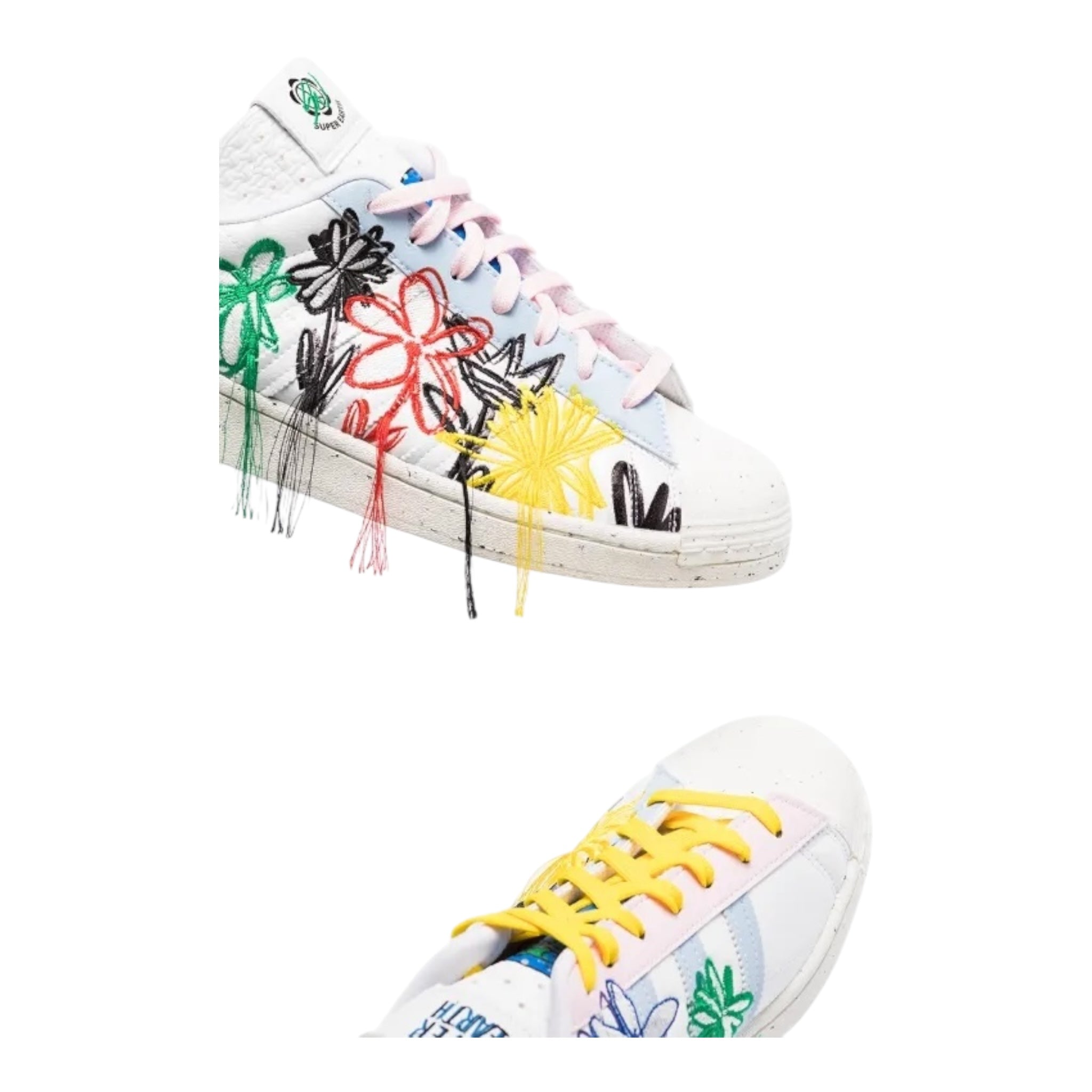 The SuperEarth Superstar combines Wotherspoon’s love for vintage clothing with his vegan-focused mission. The upper is white with multicolored flower embroidery that wraps each shoe. Pastel blue and pink overlays are scattered throughout the silhouette to give a youthful vibe. At last, a graphic drawing of the Earth is printed on each tongue below branded tabs that sport the design’s name.